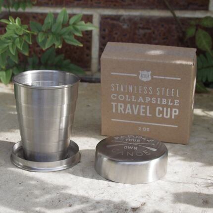 折り畳み可能なステンレス製のトラベルカップ。旅に最適なカップです。